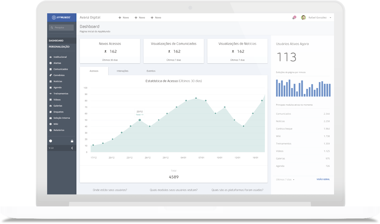 O AppMundo é um aplicativo móvel de endomarketing e comunicação criado para conectar empresa, gestores, parceiros e equipes. O app conta com diversas funcionalidades como comunicados, alertas, treinamentos, enquetes, agenda corporativa, vagas internas, contracheque e muito mais.
